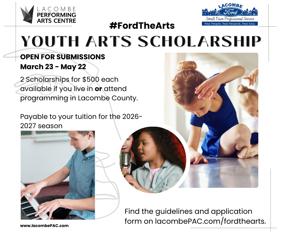 This annual scholarship is awarded by Lacombe Performing Arts Centre in partnership with Lacombe Ford to support youth in art programming. This scholarship is to be used to pay for classes/instructor fees for the 2026-2027 season and will be made payable to the instructor/program.